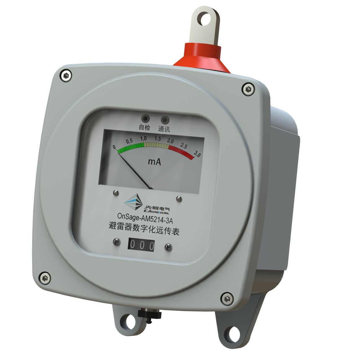 The lightning arrester action count is displayed using a 3-digit mechanical counter. The full current is displayed using a mechanical pointer meter.